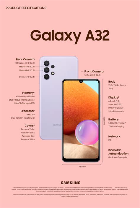 Specifications display camera cpu battery sar prices 2. Learn about the key features and specifications of the samsung galaxy a32 5g. But the samsung galaxy a32 5g has more than its iconic style to offer. Width height thickness weight write a review. The rear camera setup consists of four sensors with a 48mp main one.